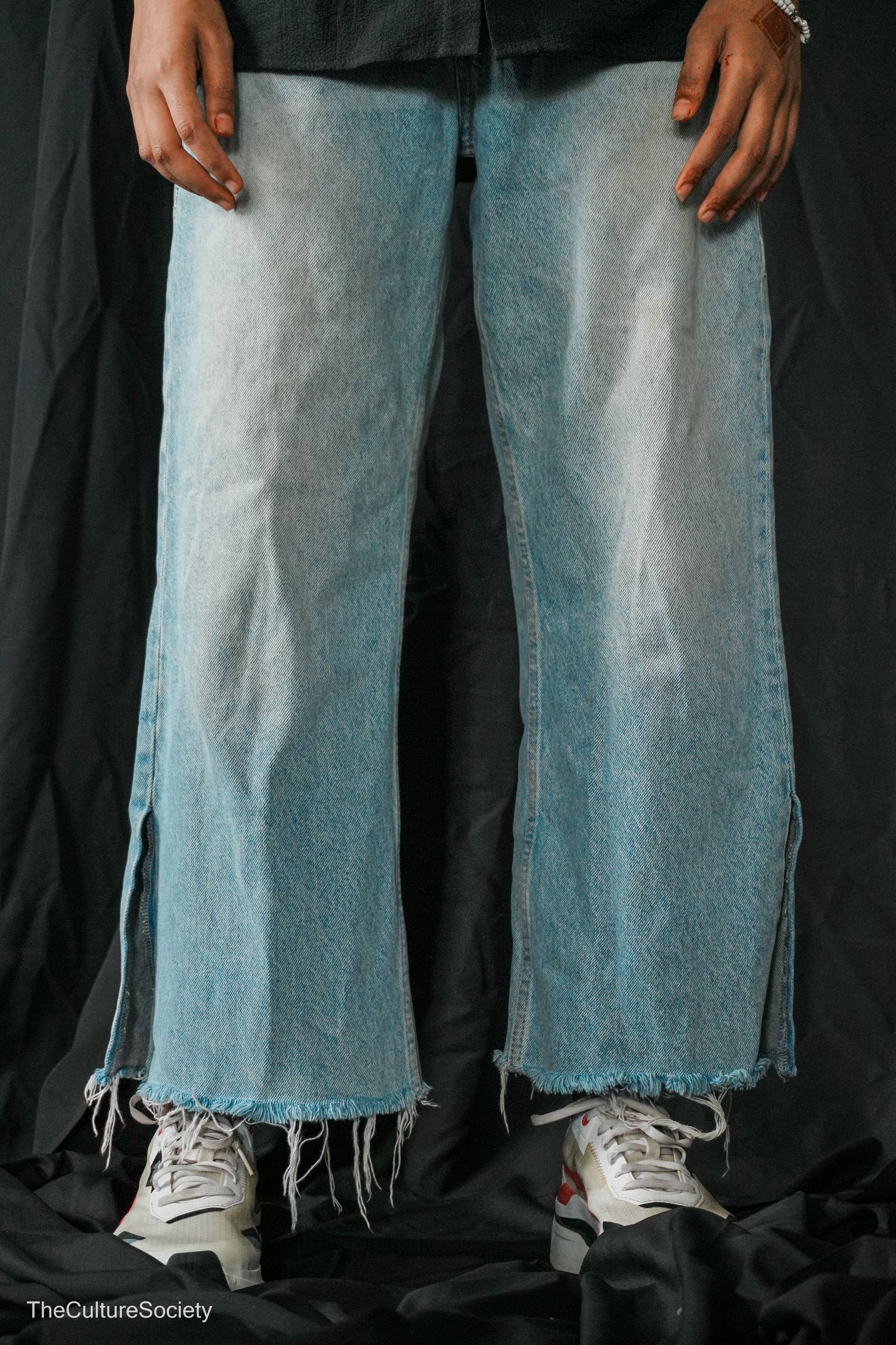 Channel vintage ease with these light blue wide-leg jeans, detailed with subtle frayed hems for an effortlessly worn-in charm. Crafted from breathable cotton, the boot-cut silhouette flatters the leg while offering comfort and versatility. A high-waisted fit adds retro appeal — perfect for pairing with tucked-in tops or oversized layers.